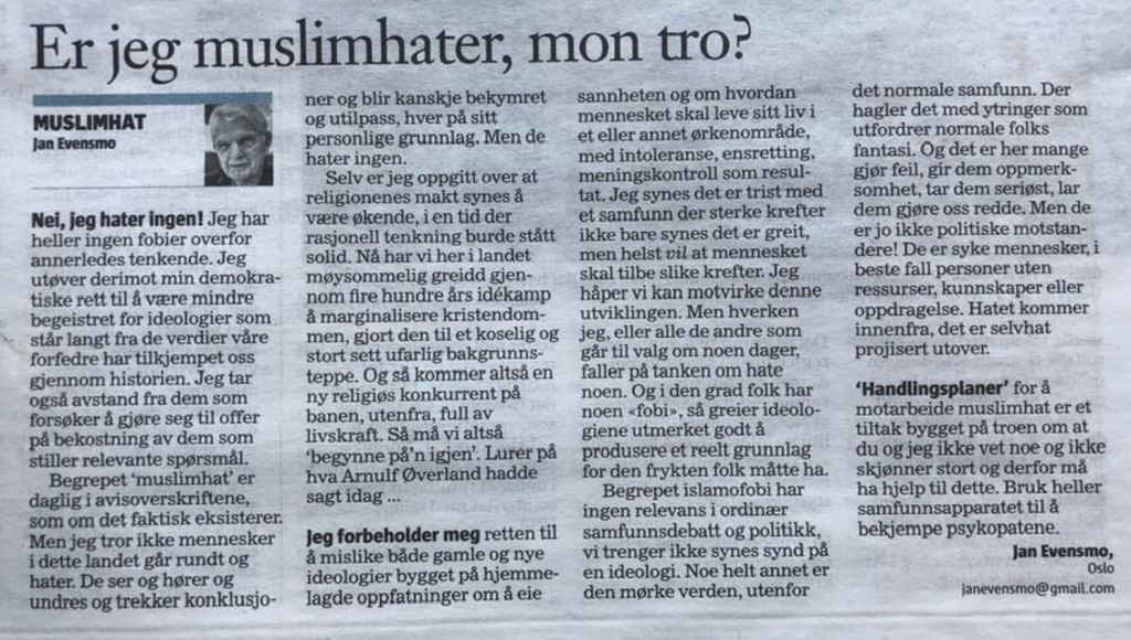 Evensmo tekst er viktig i disse tider der det manes, for ikke å si messes, frem et bilde om at muslimer i Norge har det fryktelig. Det foregår en mer eller mindre organisert kamp fra noen muslimer for å etablere begrepet «muslimhat», de samme som vil statlig etablere det vel så vanvittige begrepet «islamofobi». Og nå har de seiret med førstnevnte – «muslimhat» – på bekostning av hvem?