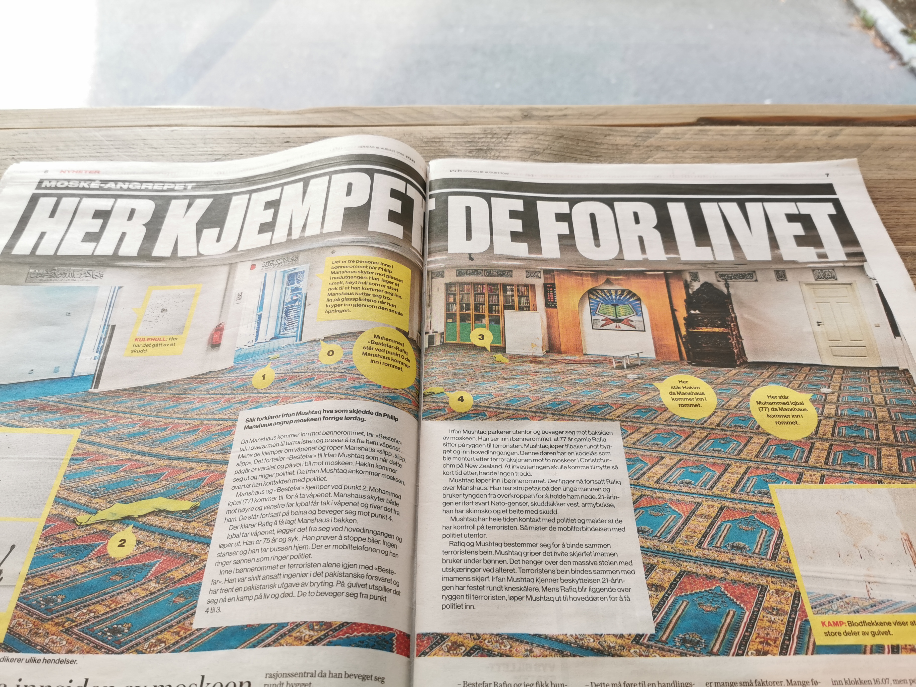 «Blod på gulv og vegger. Kulehull. Og knuste vinduer. Angrepet mot Al-Noor-Moskeen har satt sine spor.»