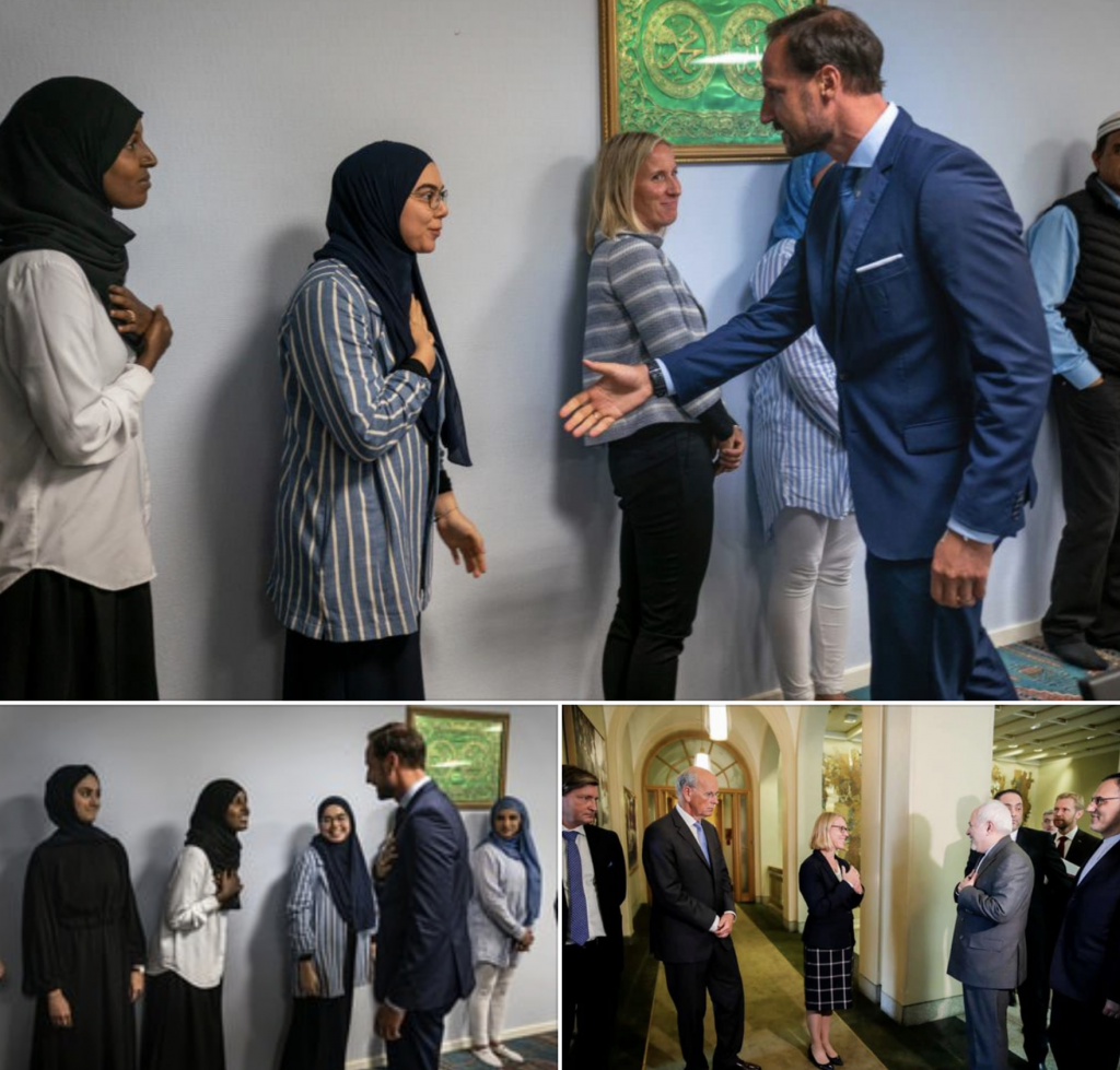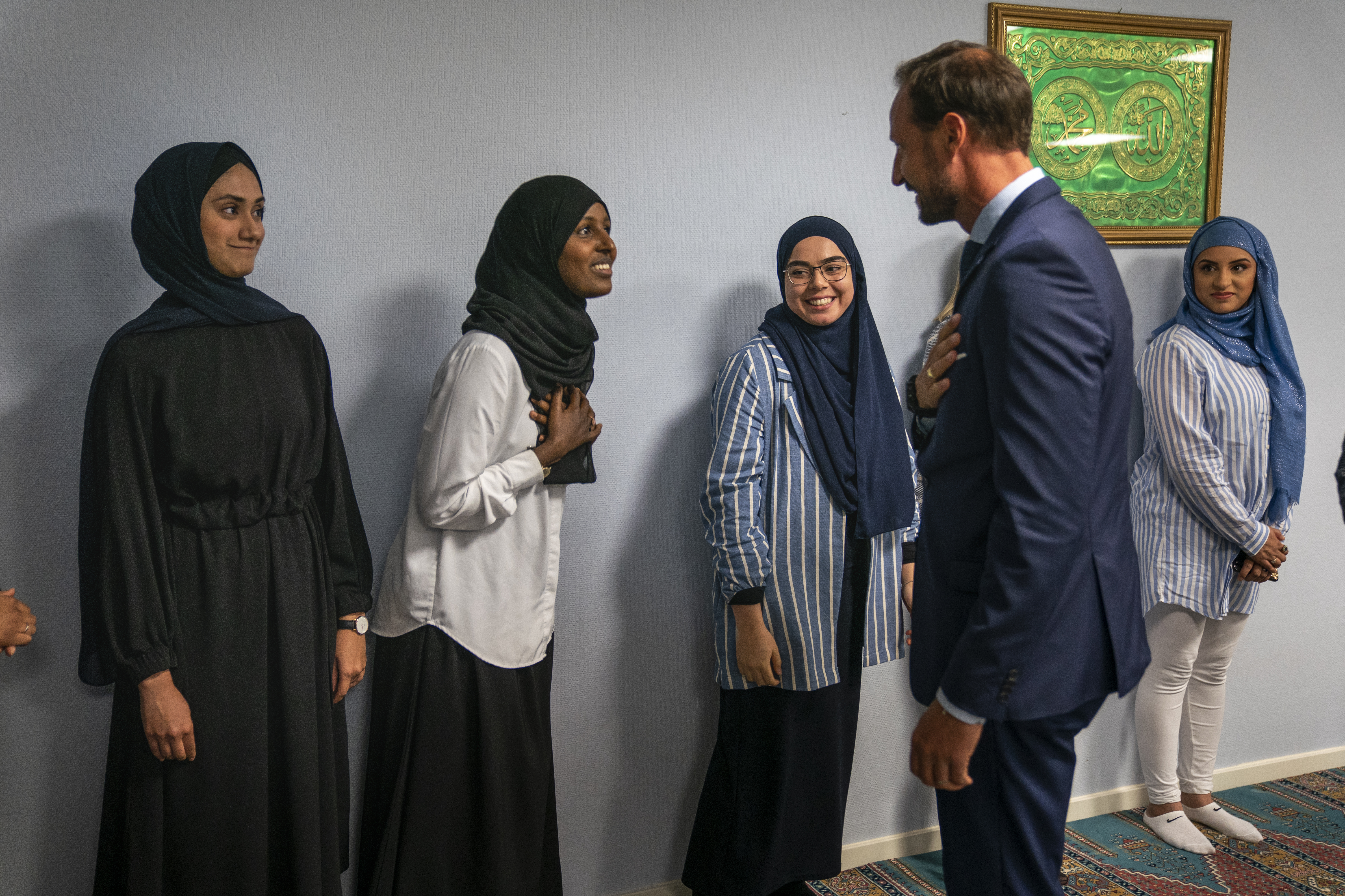 BÆRUM Kronprins Haakon prøver forgjeves å håndhilse på Faiza (i midten) Fatima (.v.) og Sriha da han besøker den terrorrammede moské åal-Noor Islamic Center på Skui i Bærum. Blodflekker og kulehull er synlige etter skyting og basketaket da Phillip Manshaus tok seg inn i moskëen. Foto: Heiko Junge / NTB scanpix