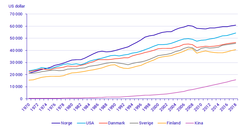 Sammenligner vi de nordiske landene, Norge, Sverige, Danmark og Finland, med USA og Kina, ser det slik ut (kilde: OECD, US Dollar, PPP 2010):