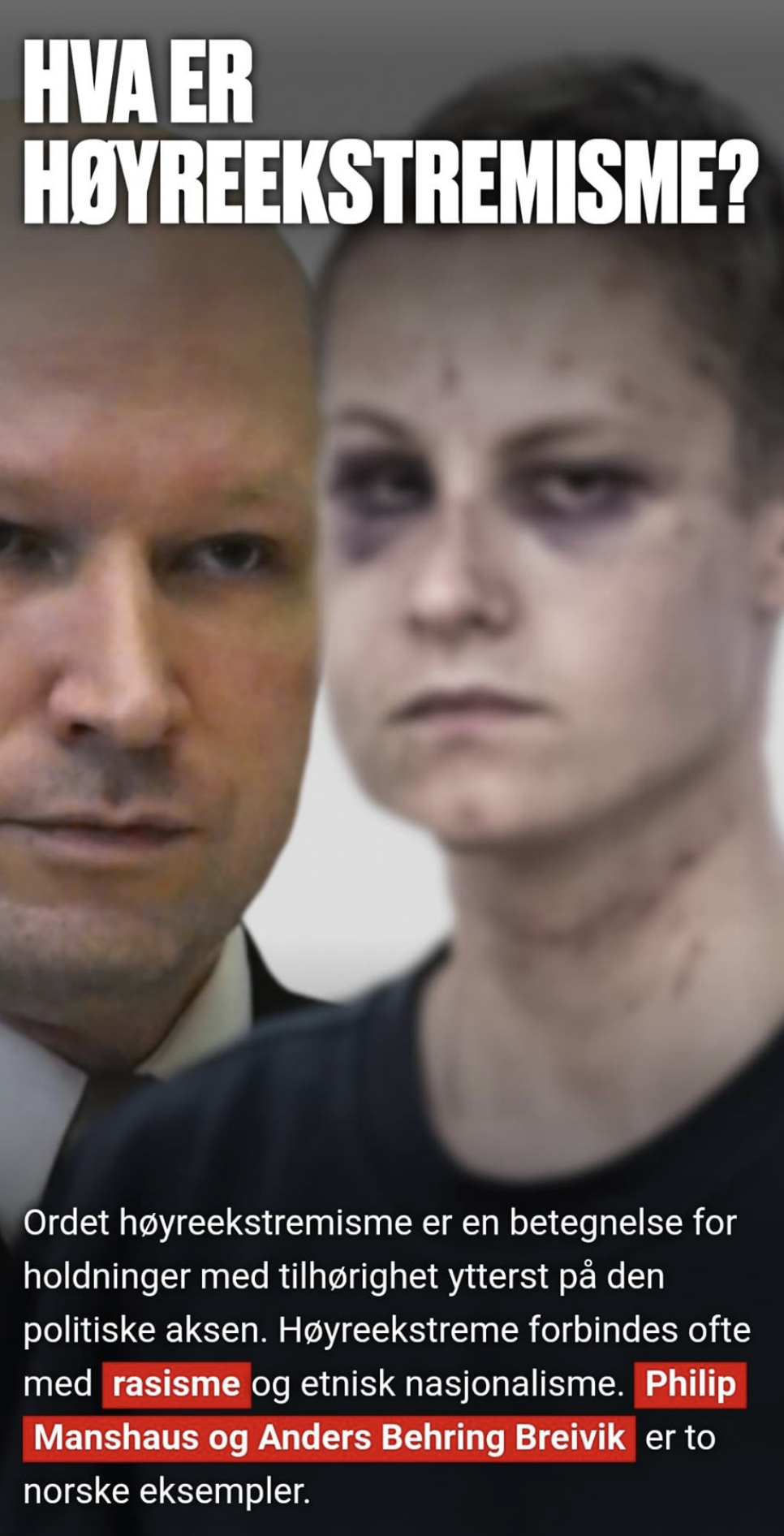 «Ordet høyreekstremisme er en betegnelse for holdning med tilhørighet ytterst på den politiske aksen. Høyreekstreme forbindes ofte med rasisme og etnisk nasjonalisme. Philip Manshaus og Anders Behring Breivik er to norske eksempler.»