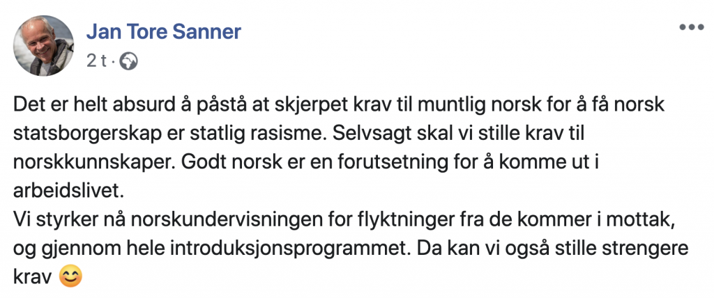 At en person som gjør krav på norsk statsborgerskap må beherske forventingene i B1, er altså ifølge SL å betrakte som «statlig rasisme». Det er intet mindre enn absurd, som også er Sanners svar.