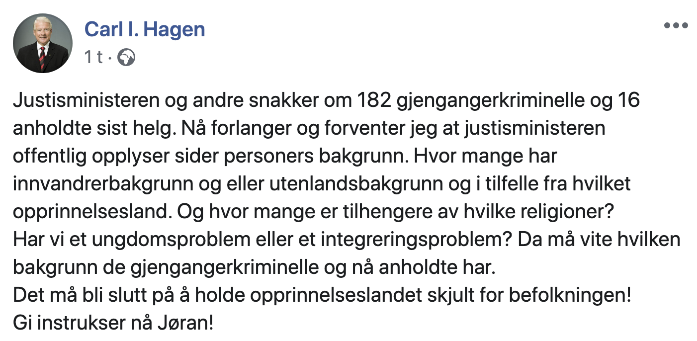 Justisministeren og andre snakker om 182 gjengangerkriminelle og 16 anholdte sist helg. Nå forlanger og forventer jeg at justisministeren offentlig opplyser personers bakgrunn. Hvor mange har innvandrerbakgrunn og eller utenlandsbakgrunn og i tilfelle fra hvilket opprinnelsesland. Og hvor mange er tilhengere av hvilke religioner?