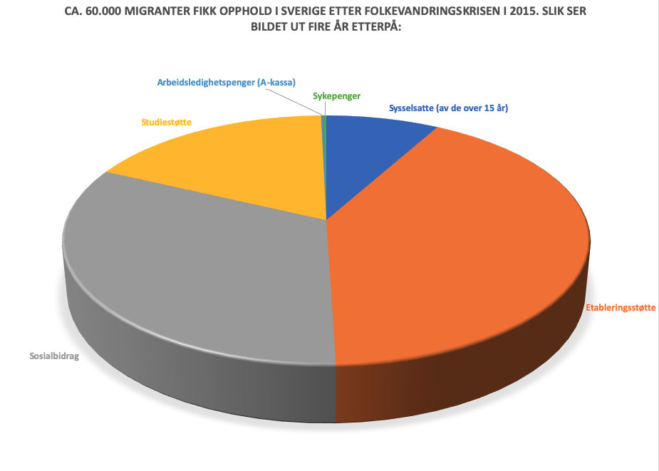 En ting er nå studiestøtte, men det nok av andre stønader og bidrag som deles ut. Slik jeg tolker Aftonbladet har de beregnet disse stønadene ut fra den totale gruppen, summert opp til 56.603 personer via fordelingen av bidrag, som igjen kan tilsi at også barn teller med. Det gjør at det blir lite treffende å formidle disse tallene som prosentandel av gruppen. Samtidig fremkommer det via deres grafikk at 162.877 søkte asyl, mens 60.501 personer fikk permanent oppholdstillatelse. Denne differansen (56.603 versus 60.501) kunne kanskje tyde på at barn er utelatt, men ut fra aldersfordelingen tilsier det at nesten 26.000 av dem som fikk opphold var under 15 år. Uansett så ser tallene slik ut: