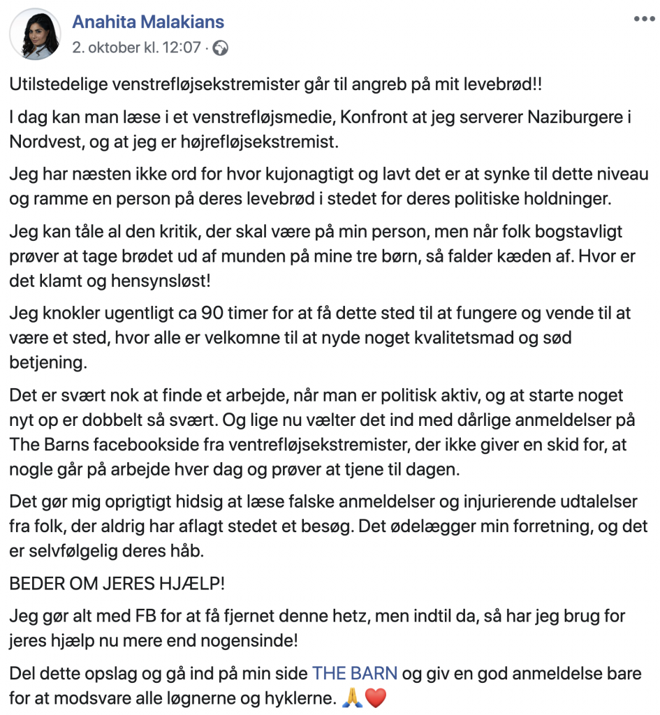 Og da så det venstreorienterte mediet Konfront sitt snitt til å kaste skitt: «For få måneder siden agiterede hun mod muslimer og islam. Nu har hun åbnet en burgerbar», heter det innledningsvis, under overskriften: «Naziburger: Højreekstremist åbner burgerbar i Nordvest».