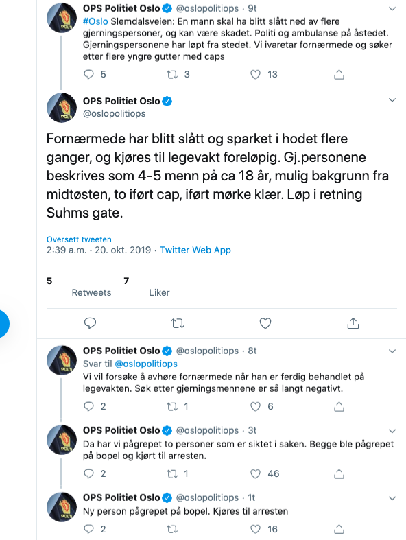 Så er det en mann i Slemdalsveien som blir slått ned av en gjeng. Gjerningspersonene beskrives blant annet som antatt bakgrunn fra Midtøsten, og nå i morgentimene skal tre av disse være pågrepet. (Og for alt vi vet; sluppet løs igjen).