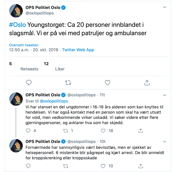 Rett over midnatt fikk politiet melding om masseslagsmål på Youngstorget. Seks mistenkte blir pågrepet, og man kan vel anta at de allerede i skrivende stund er sluppet løs – mens operativt politi antakelig enda skriver rapport om hva som skjedde.