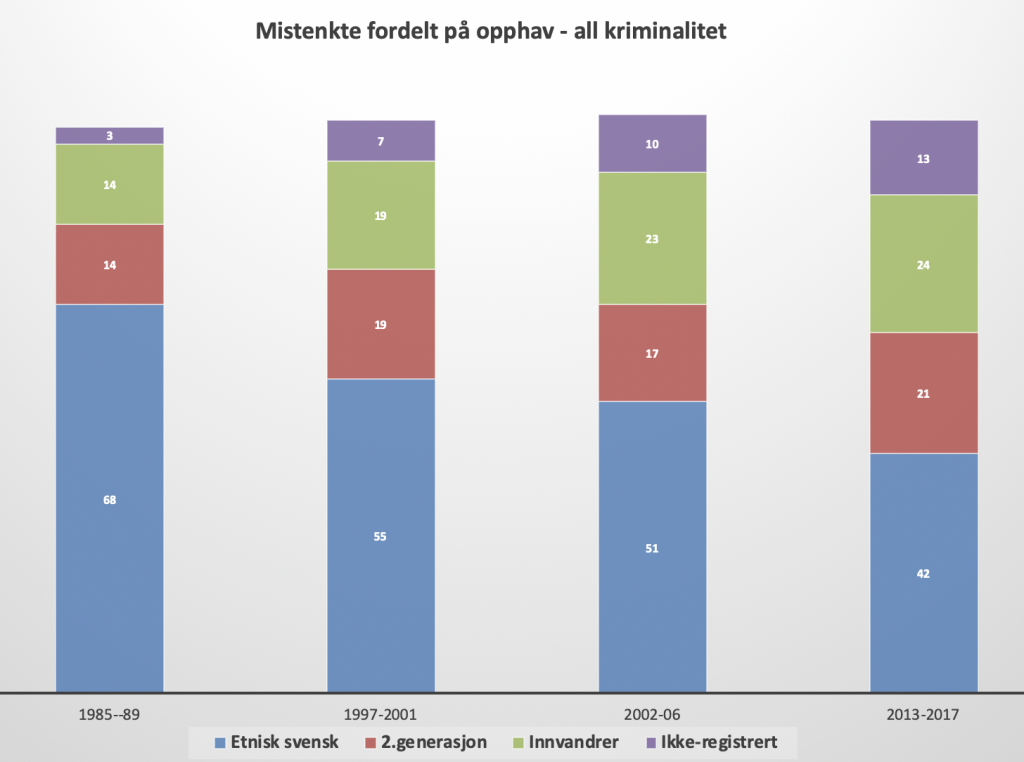 Brå har (etter en politisk beslutning fra sosialdemokratene) ikke siden 2005 kartlagt sammenhengen mellom etnisk opphav og kriminalitet, samtidig som landet bare etter at migrantkrisen brøt ut i 2015 har mottatt hundretusener av innvandrere. Men tenketanken Det Goda Samhäll tok saken i egne hender, og ved data fra Brå fant de følgende (merk også at innvandrerbefolkningen i 1985 utgjorde 18 prosent av befolkningen, i 2017 utgjorde de 33 prosent, men til tross for det er de overrepresentert på alle kriminalitetskategorier som her er omtalt):