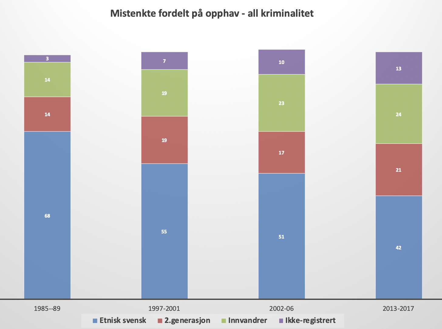 Brå har (etter en politisk beslutning fra sosialdemokratene) ikke siden 2005 kartlagt sammenhengen mellom etnisk opphav og kriminalitet, samtidig som landet bare etter at migrantkrisen brøt ut i 2015 har mottatt hundretusener av innvandrere. Men tenketanken Det Goda Samhäll tok saken i egne hender, og ved data fra Brå fant de følgende (merk også at innvandrerbefolkningen i 1985 utgjorde 18 prosent av befolkningen, i 2017 utgjorde de 33 prosent, men til tross for det er de overrepresentert på alle kriminalitetskategorier som her er omtalt):