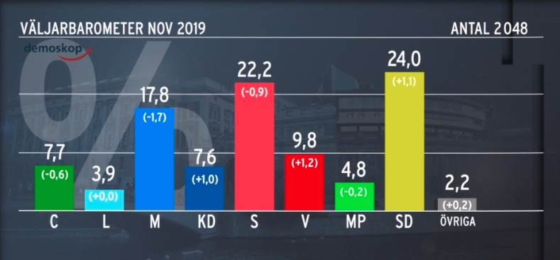Dette tilsier at S+MP+C+L ville fått 38,6 prosent av stemmene, mot SD+M+KDs 49,4 prosent.