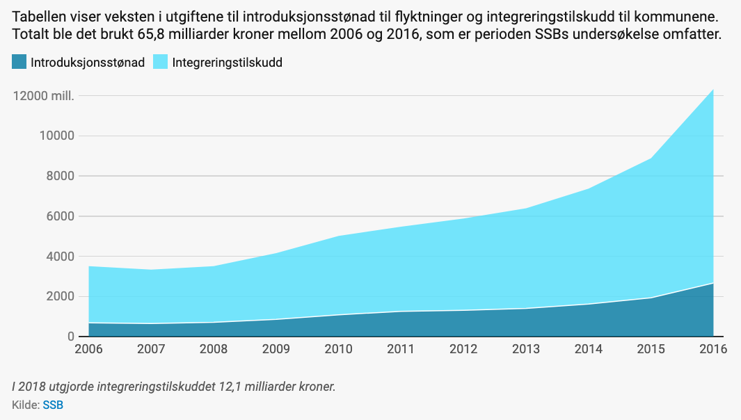 Når til og med Aftenposten begynner å grave i kostnader til innvandringen, så må man kunne si at flere har våknet. Avisen har sett på rapporten til Statistisk sentralbyrå (SSB) om deltakere i introduksjonsordningen, og kan fortelle at i perioden 2005 til 2016 fullførte 37.000 flyktninger (og asylanter) den obligatoriske introduksjonsordningen. Prislappen for dette var på 65,8 milliarder kroner. Det er fryktelig mye penger.