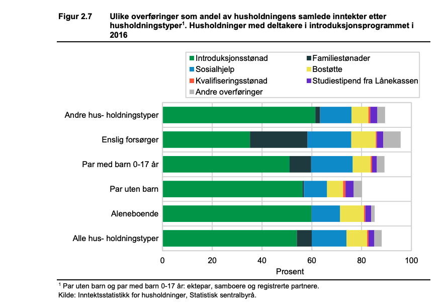 Vi kan jo begynne med å vise til noen av de andre kostnadene. For i 2016 var full introduksjonsstønad i gjennomsnitt 183.000 kroner per person, og dermed må det supplerende inntekter – eller stønader – til. Slik ser det bildet ut (fra SSB-rapporten):