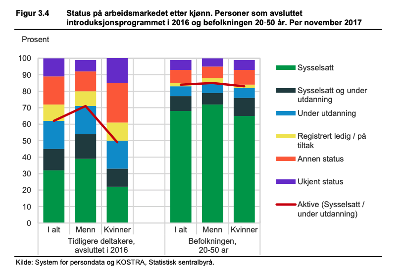 Det «overordnede» bildet forteller oss at 62 prosent av de som avsluttet introduksjonsprogrammet i 2016 (ca. 4.800 personer), var aktive, altså sysselsatt (gitt én-times definisjonen til SSB) eller under utdanning, i november året etter. 17 prosent var under utdanning, som tilsier at sysselsatte utgjorde 45 prosent.