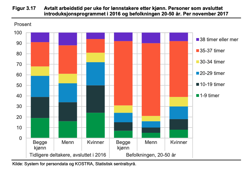 Når vi nå vet at 45 prosent var i jobb der 31 prosent var i heltidsjobb, så har SSB også sett på fordelingen av timer sammenlignet med befolkningen: