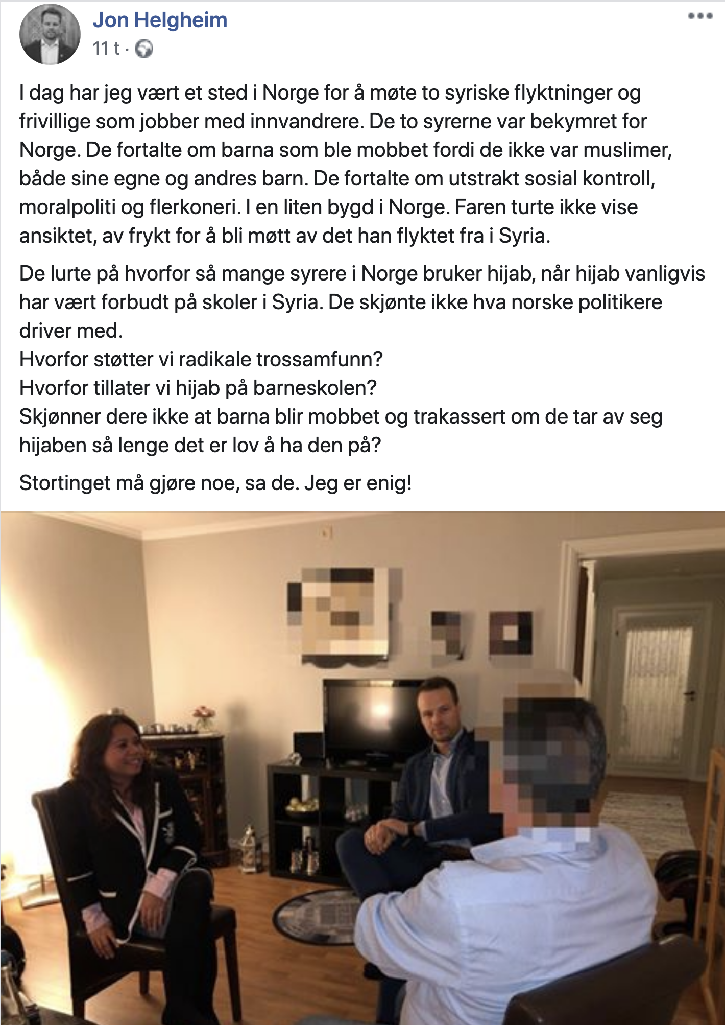 - Hvorfor tillater vi hijab i barneskolen? Skjønner dere ikke at barna blir mobbet og trakassert om de tar av seg hijaben så lenge det er lov å ha den på?