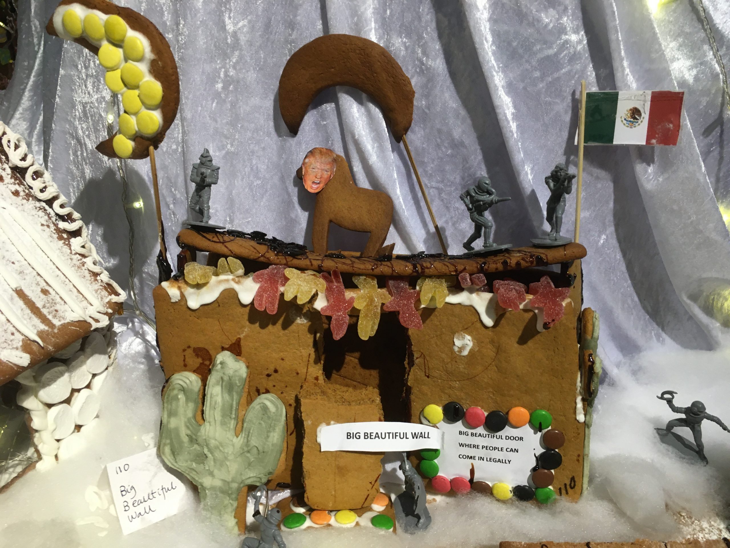 Vi kan vel trygt slå fast at Aftenbladet holder det de sier – det «gnistrer» av denne utstillingen, om enn ikke slik denne lille familien hadde tenkt seg. For her mangler det ikke på effekter med et illsint hodebilde av den amerikanske presidenten Donald Trump påklistret en hest på toppen av muren og med soldater med våpen på alle kanter, mens seigmennene prøver å komme seg over. For the big beautiful door hvor folk kan komme inn lovlig, er lukket og festet med Non Stop sjokolade. Også det meksikanske flagget er på plass, mens det forjettede lands flagg glitrer i sitt fravær.