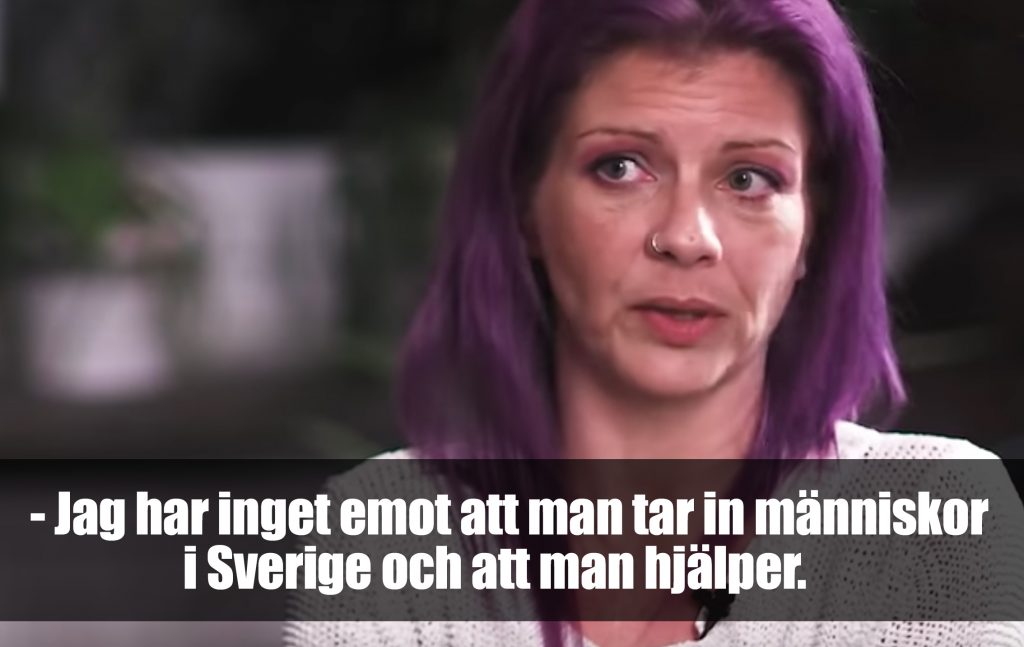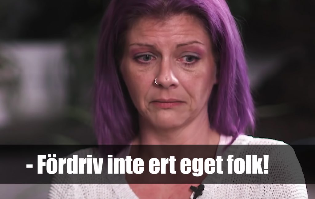 En gråtende mor skyter inn: «Jeg har ingenting imot at man tar imot folk i Sverige og at man hjelper. Men se til helvete å hjelpe deres egne først», hikster hun, og fortsetter: «Ikke fordrive deres eget folk.»