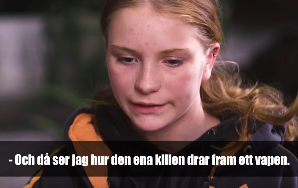 – Jeg ser at en av guttene tar frem et våpen, setter pistolen mot hodet til Hampus, bakfra, og de skrek trykk, fortsetter Bella.