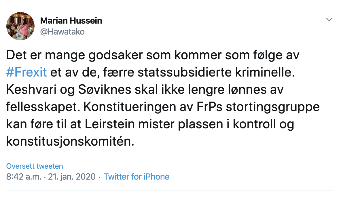 Nå er det visstnok ikke så nøye for SV-Hussein, som kanskje er mest kjent for å være den første på Stortinget med hijab, om noen av disse «statsfinansierte kriminelle» er kriminelle. Det vesentlige for denne stortingsrepresentanten er å slenge dritt om FrP-ere. Men kanskje SV skulle lære å feie for egen dør?