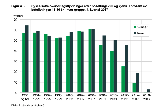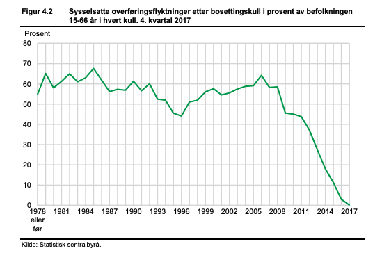 Selv om man tar høyde for at sist ankomne (2016 og 2017) deltar på introduksjonsprogrammet og dermed ikke er i jobb, så går det utvilsomt nedover med sysselsettingen blant kvoteflyktningene. Absolutt lavest er den for kvinner: