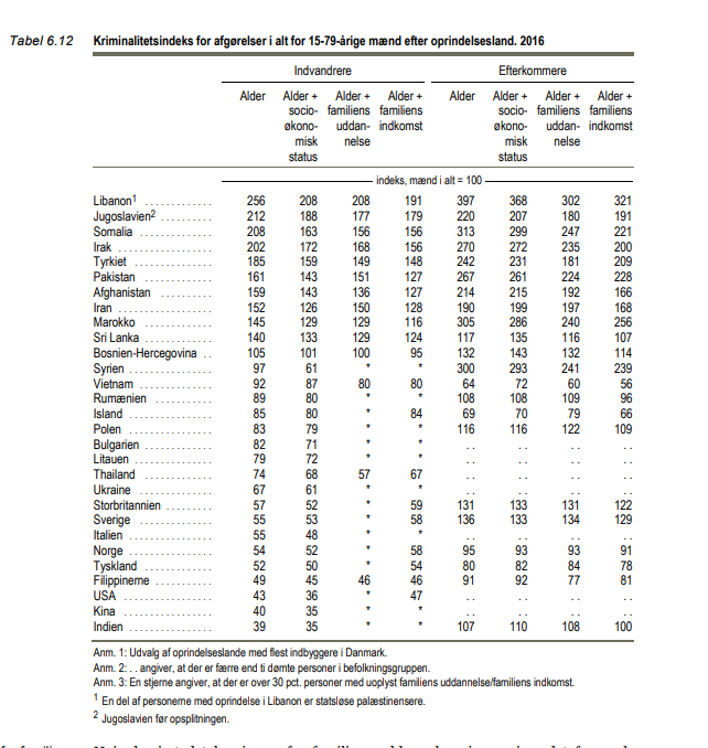 I Danmark legger Dansk Statistik (DST) årlig frem kriminalitetsstatistikk basert på landbakgrunn (her 2018-rapporten), og statistikken taler grundig mot Einarsen. Libanesere, eks-jugoslavere, somaliere, irakere, tyrkere, pakistanere, afghanere, iranere, og marokkanere, troner på toppen.