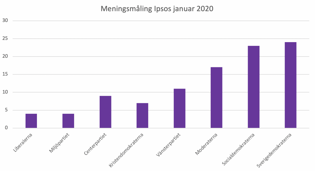 Moderaterna (Høyres søsterparti), som har holdt armlengdes avstand til SD over tid, kan bare konstatere at de selv vaker rundt 17 prosent. Men kanskje siden partiet har ikledd seg neseklype og faktisk imøtegått SD på visse politiske områder, ikke minst på innvandringsfeltet, kan de likevel notere en fremgang på 1 prosentpoeng fra forrige måling (desember 2019).