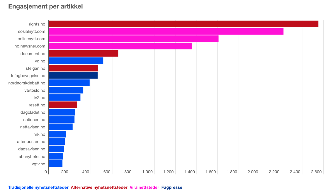 Faktisk.no har laget en oversikt over spredning av saker på internett i 2019, som måles av Storyboard.mx. Avsender er delt opp i tradisjonelle medier, alternative nyhetssteder, viralnettsteder og fagpressen. De ser på hvordan disse fordeler seg på totalt engasjement (mest spredning), viralvinnere (de mest delte enkeltsakene) og engasjement per artikkel.