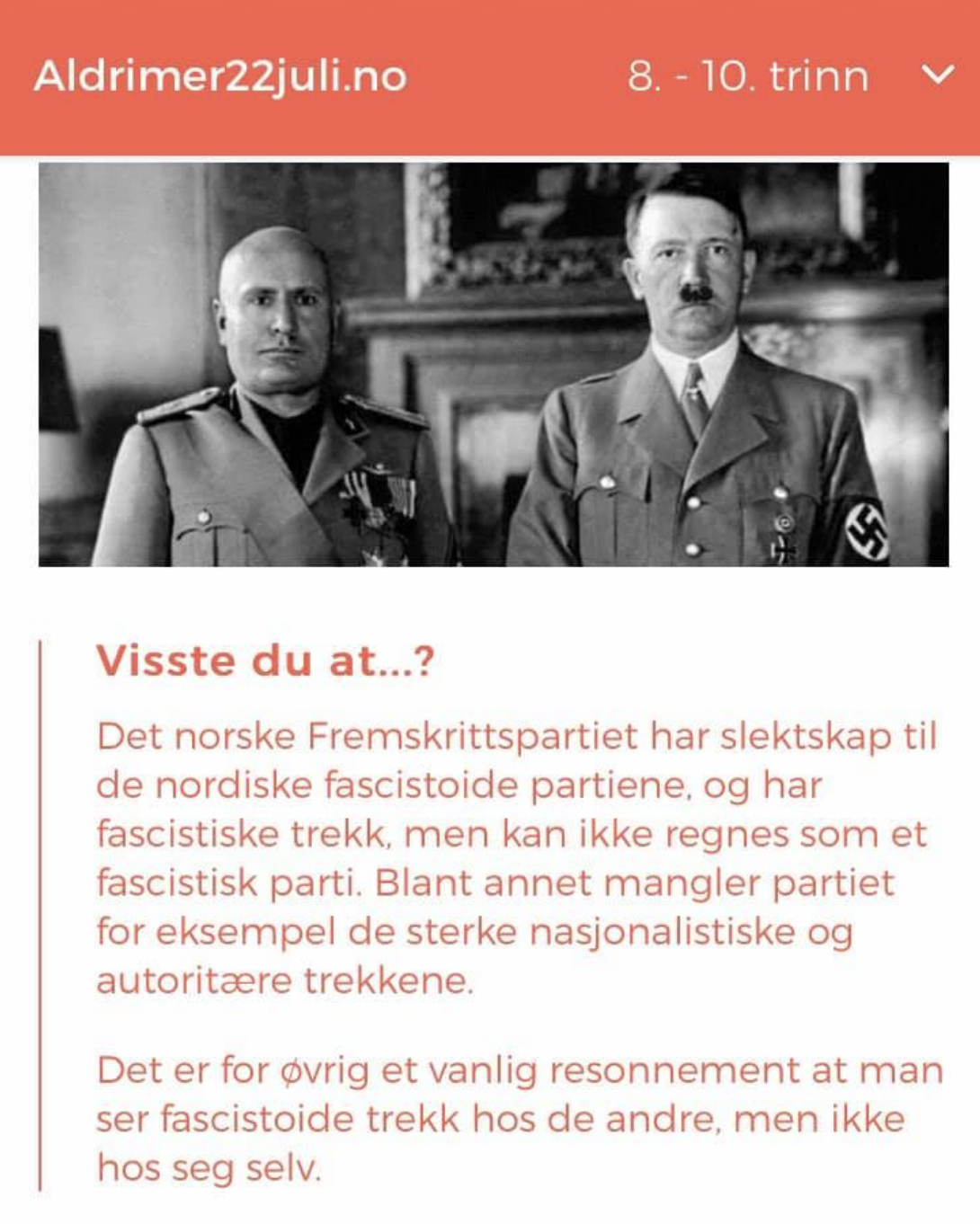 Så hvorfor forsvant ARS i saken? Sannsynligvis fordi det i går ble avdekket at ARS gjør det de beskylder HRS for, nemlig uvettige koblinger. ARS har koblet, i undervisningsportal for 8. til 10.klasse, Fremskrittspartiets historie til Mussolini og Hitler. Og det har de fått støtte av fra Utdanningsdirektoratet. Det kan du lese mer om hos for eksempel Minerva.no.