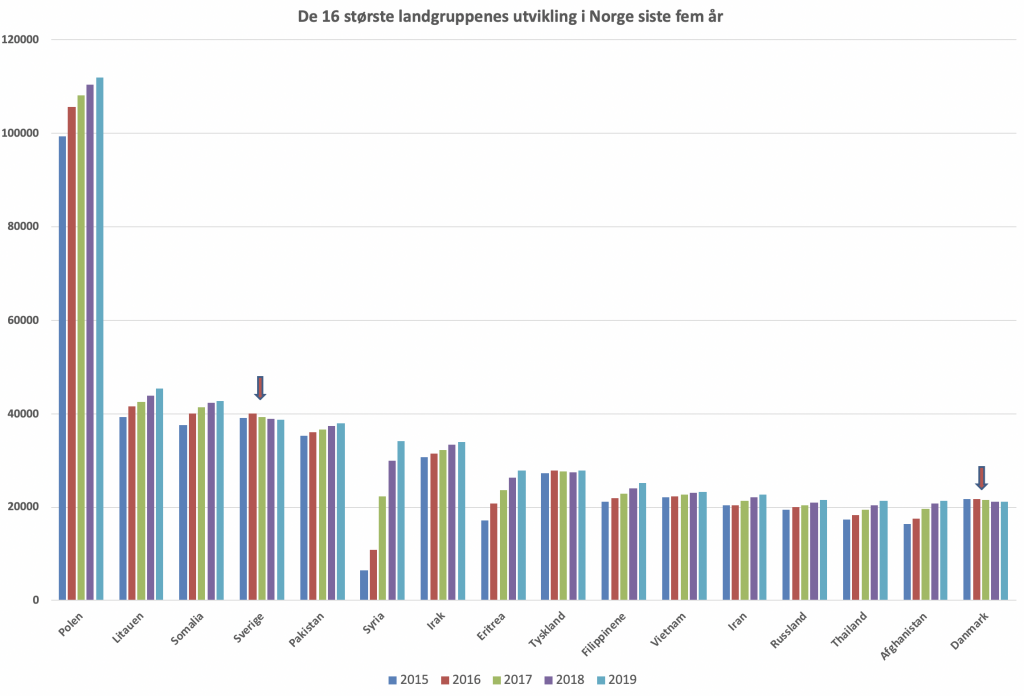 Størst ikke-vestlig økning har vi fra Syria, som økte med 4.223 fra 2018 til 2019. Siden 2015 har de økt med 27.676 personer. Økningen er det også fra Litauen, fra Somalia, Pakistan, Irak, Eritrea osv. De eneste som har nedgang i samme periode, er svenskene og danskene.