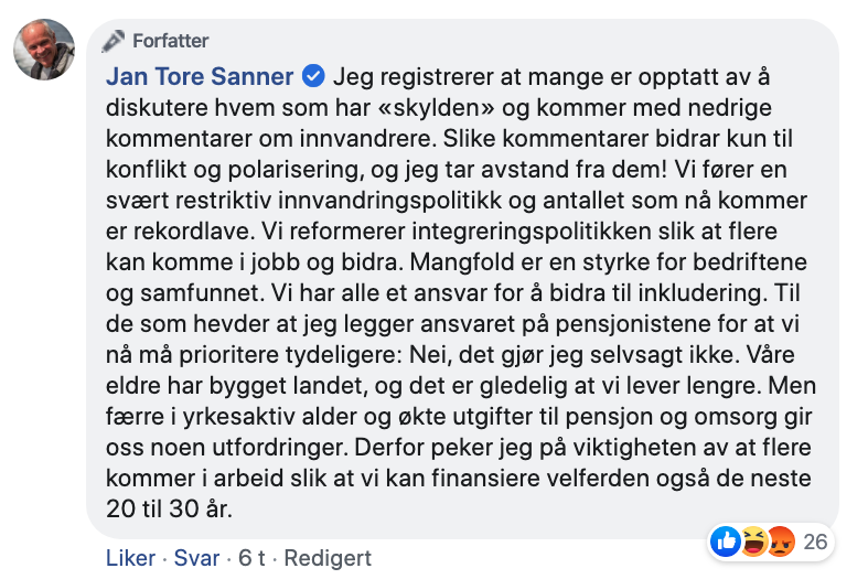 Den som i utgangspunktet var opptatt med å fordele «skyld» var Sanner selv. Hadde han vært ærlig, så hadde han sagt noe om hvor kostnadskrevende spesielt den ikke-vestlige innvandringen er, men det ville han åpenbart ikke. Og nå forsøker han å dreie en diskusjon om innvandringspolitikk til å handle om innvandrere.
