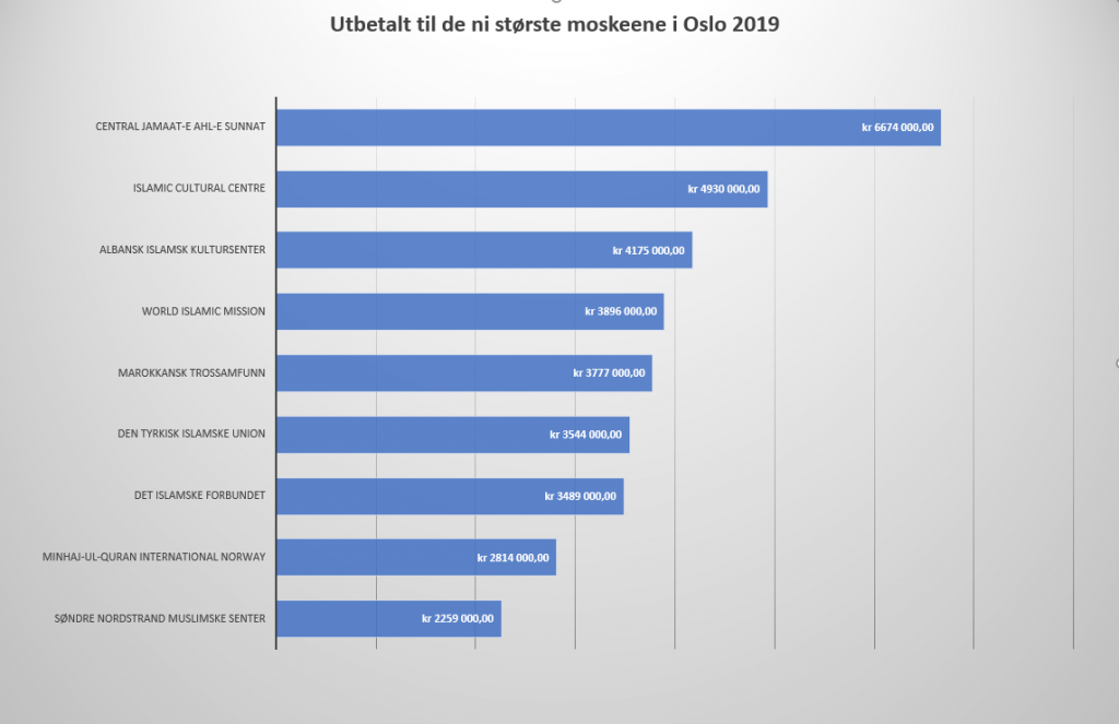 Oslo har over 50 msokeer. Når Fylkesmannens liste for 2019 offentliggjøres, kan vi således presenterer hvor mye disse moskeene samlet mottok i fjor.