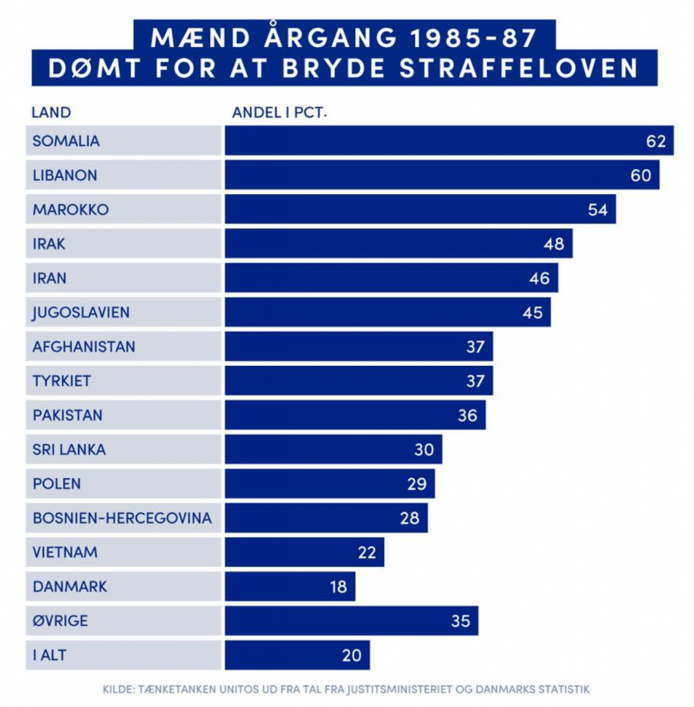 Den ferske undersøkelsen til tenketanken Unitos vekker bred oppmerksomhet i Danmark i dag. Tallene handler kun om straffeloven, ikke om brudd på trafikkloven. Det dreier seg om hærverk, tyveri, innbrudd, vold og ran, skriver Den korte avis.