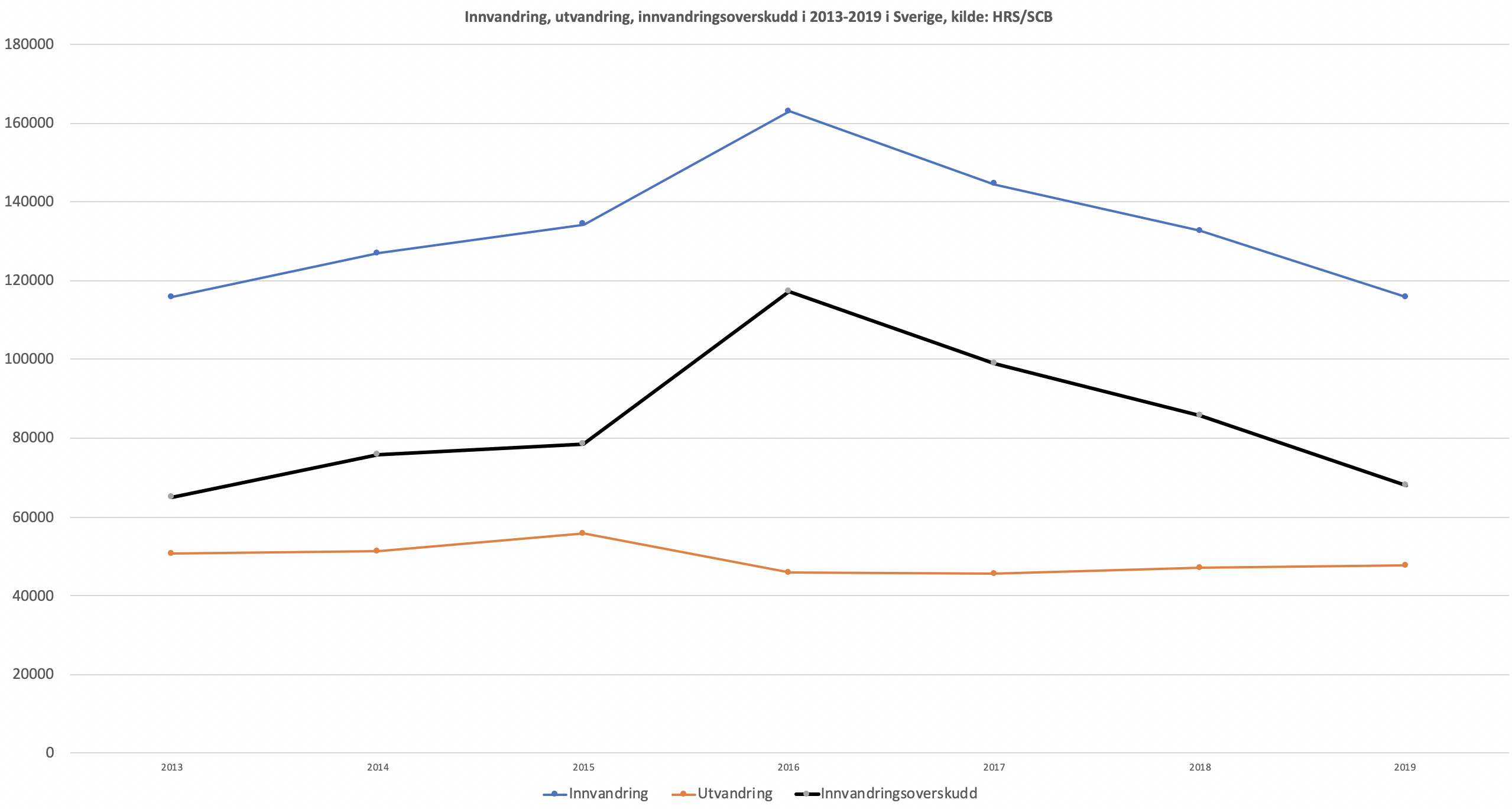Fra 2013 til og med 2019 ser bildet slik ut for innvandring og utvandring (som til sammen gir nettoinnvandring eller innvandringsoverskudd):