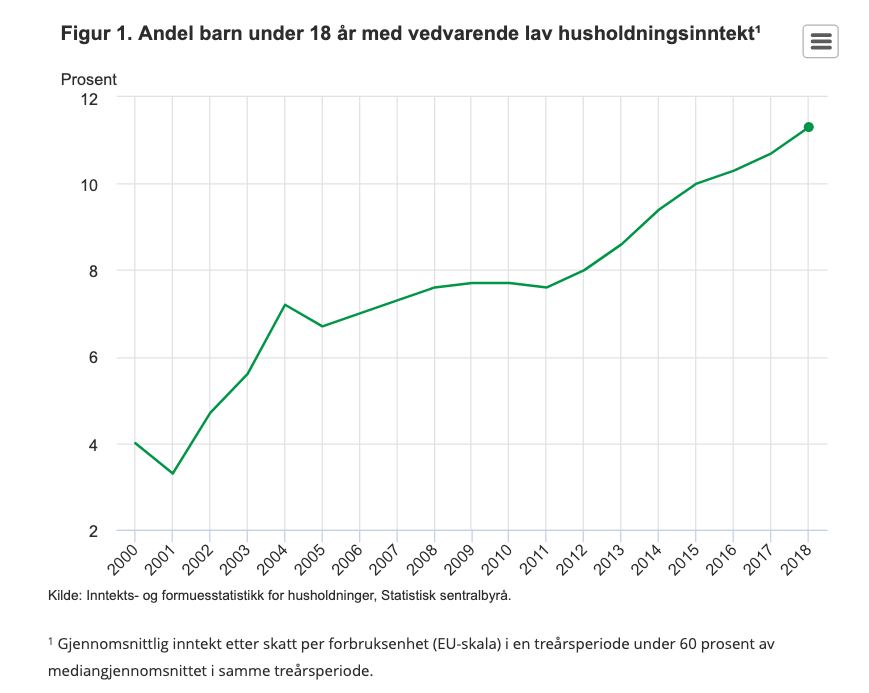 Nye tall fra SSB viser at i 2018 var det nærmere 111.000 barn under 18 år som bodde i husholdninger med vedvarende lavinntekt. Det er en økning på om lag 5.000 barn fra året før. Det gir at i alt 11,3 prosent av alle barn tilhører en lavinntektshusholdning.