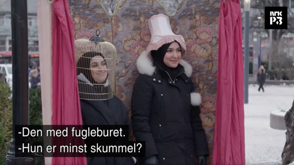 Ja, så banalt, og eksempelvis med fuglebur og lampett på hodet. Ingen blant publikum synes noe annet enn at dette er hylende morsomt og at hijab, nei, det er ikke noe annet enn et plagg på linje med skjerf.