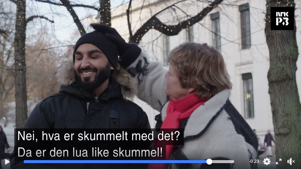 En eldre norsk kvinne får avrunde det hele med å sette skapet solid på plass: En lue på en manns hode sammenstilles med en hijab. Intelligent, ikke sant?