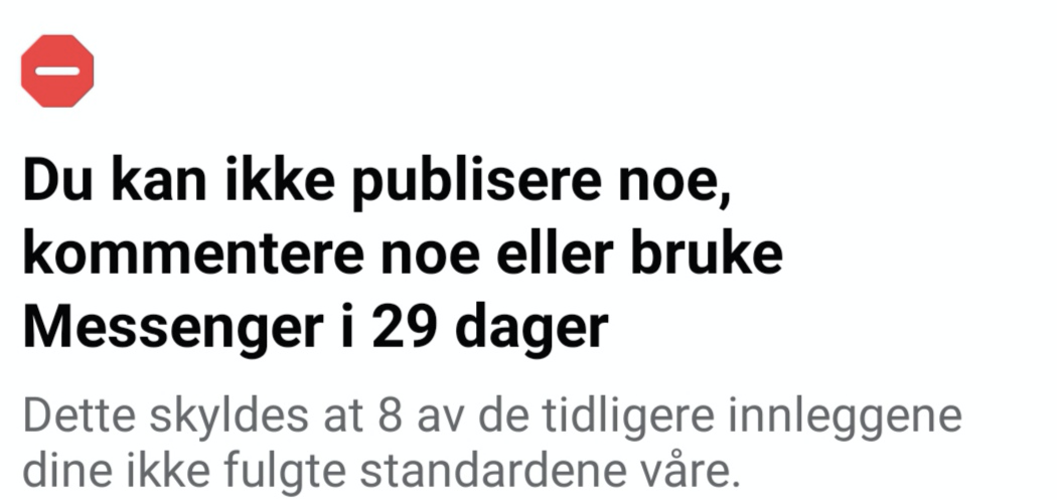 Hele åtte av mine innlegg brøt med «Facebook-standardene» denne gangen, som ut av det blå ble meddelt meg for to dager siden.