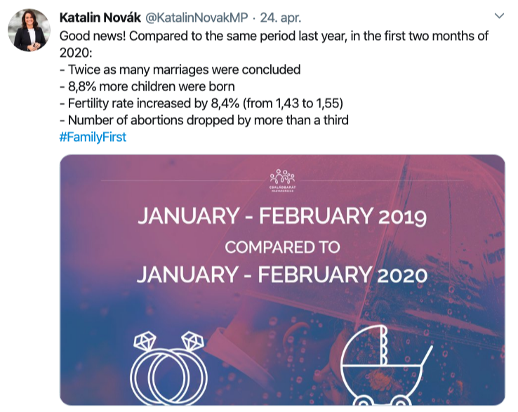 Kanskje norske politikere har noe å lære av de ungarske, heller enn å rakke ned på dem. I fjor presenterte Ungarns statsminister Viktor Orban en ny familiepolitikk for landet, som svar på nedgangen i befolkningen – som Ungarn ikke ville løse med masseinnvandring. Under mottoet Family First har kvinner og familier fått en rekke fordeler, som gunstige lån og skattelettelser. Og jo flere barn, over tre, jo flere fordeler. Nå viser tall fra Ungarn at deres familiepolitikk virker. Fruktbarhetstallet har økt fra 1,23 i 2011 til 1,5 i 2019. Antall ekteskap har økt med 84 prosent sammenlignet med 2010, samtidig har antall skilsmisser i samme periode hatt en nedgang på 29 prosent. Nylig la familieminister Katalin Novák ut en melding på Twitter der hun sammelignet årets to første måneder med fjorårets to første måneder: