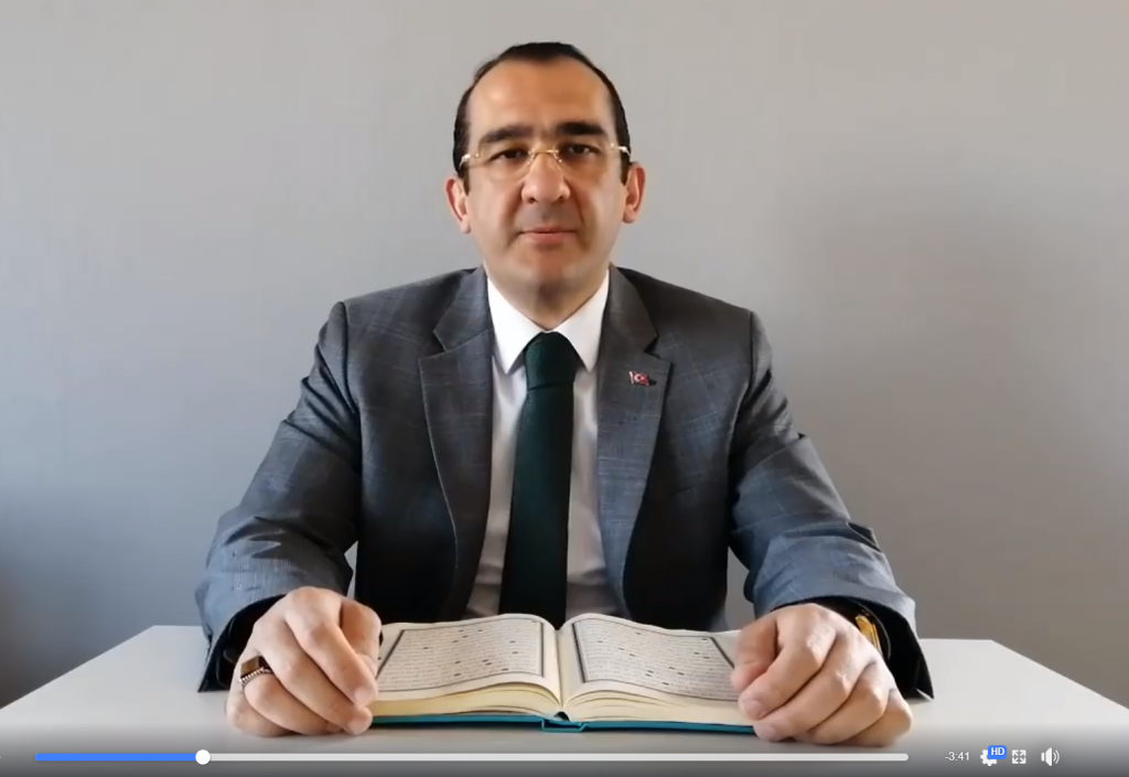 Ozer med koranen mellom hendene i videoen med budskap til tyrkere i Norge, skjermdump fra Facebook.