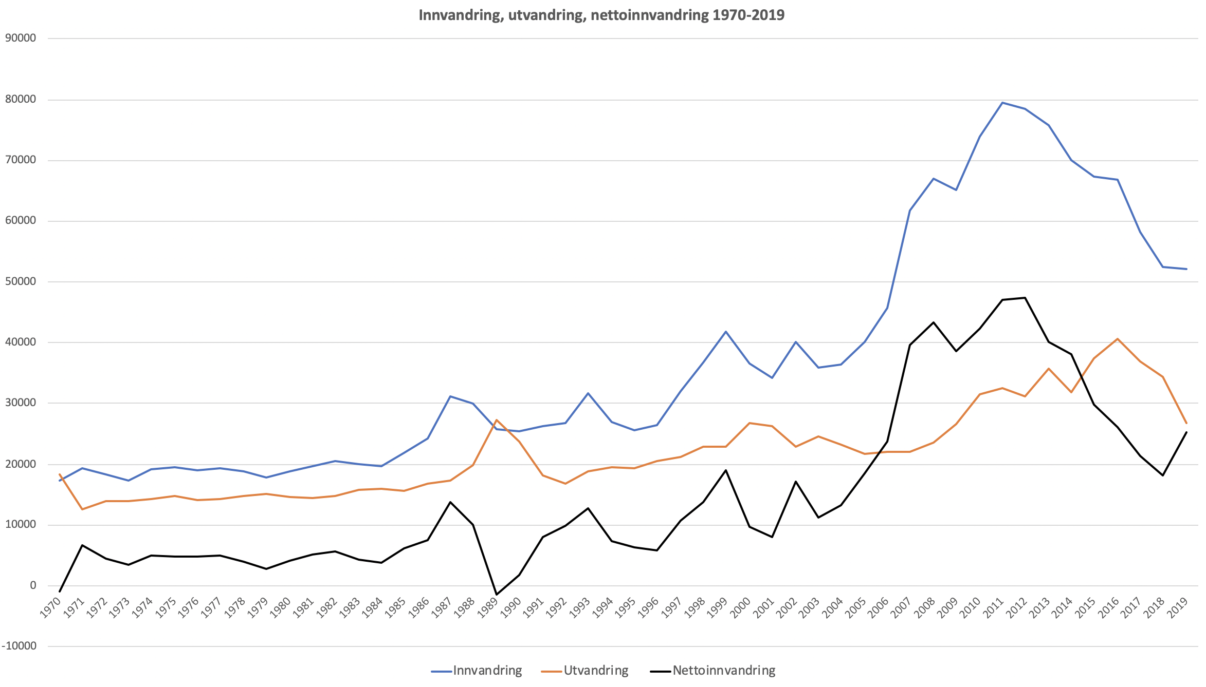 Ser vi bildet under ett fra 1970, da innvandringen til Norge begynte å ta seg opp, ser vi at kurven går rimelig raskt oppover og fra 2004 (utvidelsen av EU mot øst) bratt opp til toppen i 2011 med hele 79.498 innvandringer. I 2011 og 2012 lå utvandringen på i overkant av 30.000, mens nettoinnvandringen på over 47.000, i 2012 med en topp i perioden på 47.343. Siden 2012 har nettoinnvandringen sammenhengende gått nedover, inntil dette ble brutt i fjor.