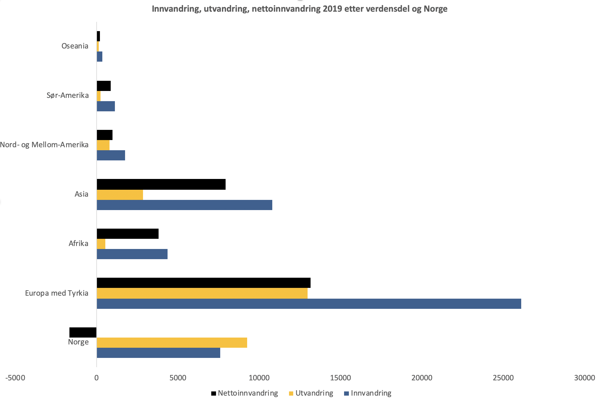 Og mens det innvandret 26.083 fra Europa (inkl. Tyrkia), så utvandret det 12.952. Fra Asia (eksl. Tyrkia) og Afrika innvandret over 15.000, mens utvandringen telte litt over 3.400 (2.864 asiatere og 549 afrikanere).