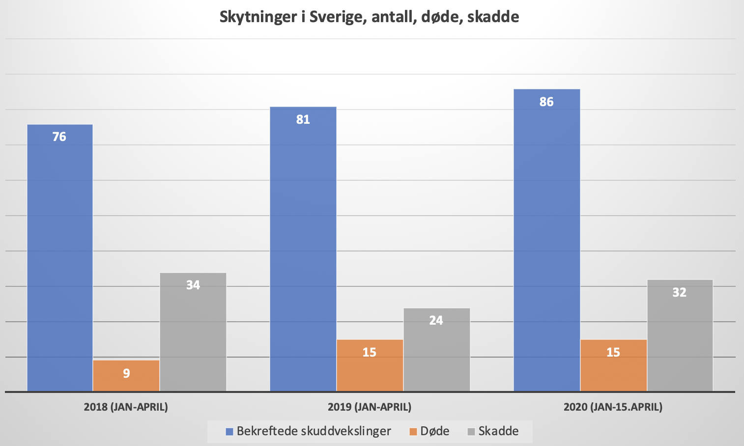 I perioden 1. januar til 15. april i år er det bekreftet 86 skuddvekslinger, med 15 døde og 32 skadde. Sammelignet med årets fire første måneder i 2018 og 2019 (merk at for inneværende år er det fortsatt 14 dager igjen å registrere) ser vi at antallet skyteepisoder fortsetter å stige. Totalt ble henholdsvis 45 og 42 i 2018 og 2019 drept med skytevåpen. Til sammenlign var det tre slike drap i Norge både i 2018 og 2019.
