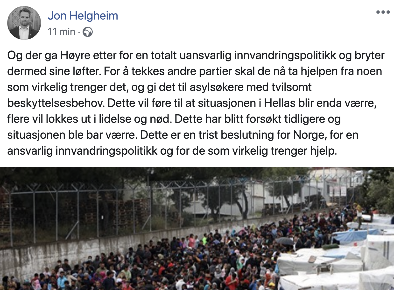 Idet dette ble kjent i formiddag, gikk Jon Helgheim rett ut på Facebook og raste mot det han mener er «uansvarlig innvandringspolitikk: