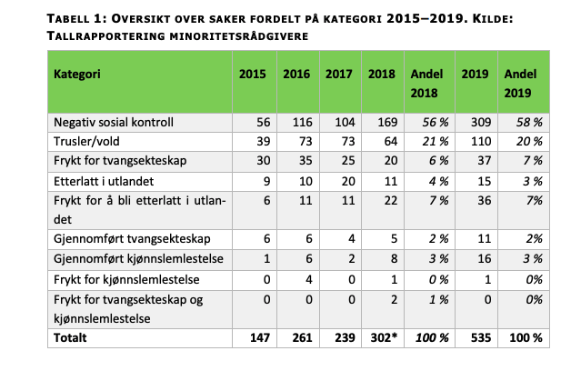 I perioden 2015-2019 er det totalt 33 saker (!) som handler om gjennomført kjønnslemlestelse, i tillegg til seks saker om frykt for kjønnslemlestelse samt to saker om frykt for kjønnslemlestelse og tvangsekteskap. I tillegg kommer alle de andre sakene, som negativ sosial kontroll, tvangsekteskap etc. Se faksimile av tabell fra IMDi.