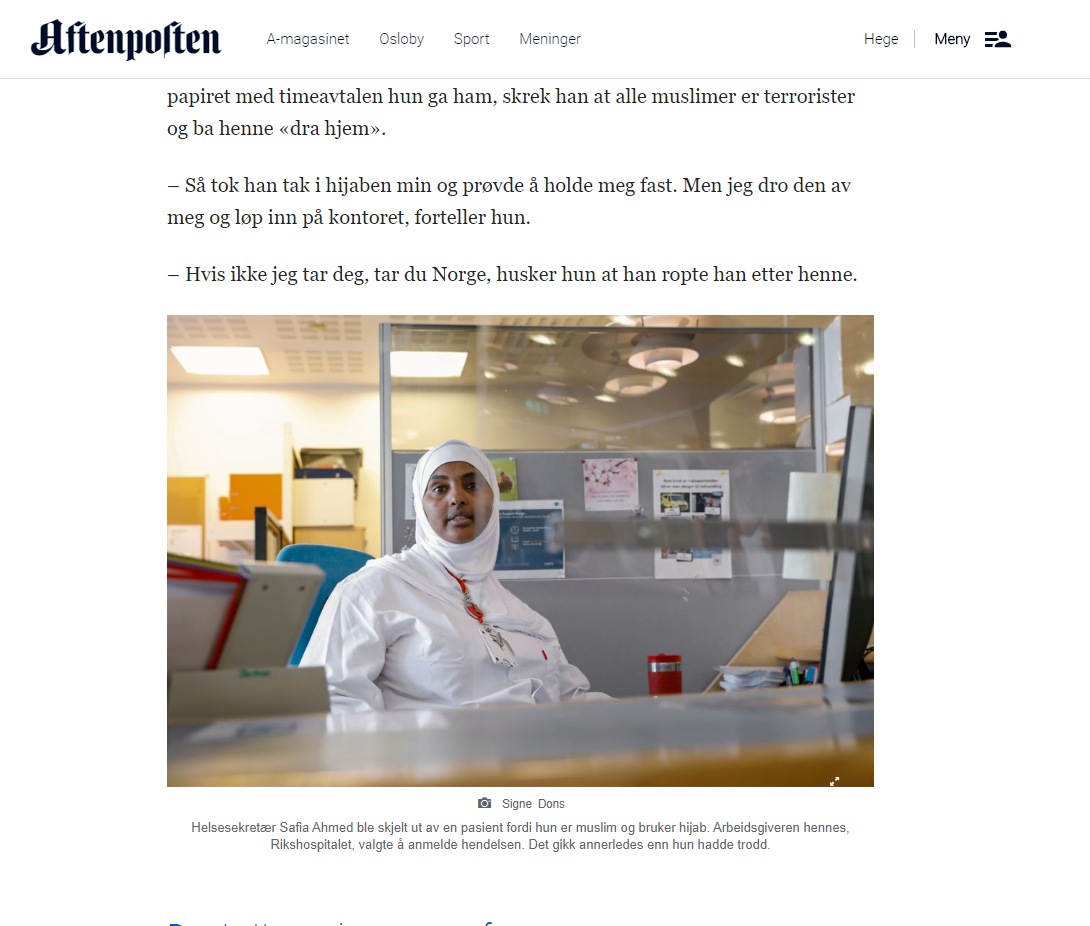 – Han ropte at han hatet hijaber og muslimer og at sånne som meg ikke skulle jobbe på sykehus, forteller hun, tilbake på avdelingen. Over to år etter hendelsen kan minnene stadig gjøre henne livredd.