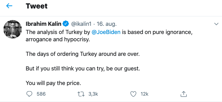 «Tiden hvor man kunne sjefe rundt med Tyrkia er slutt. Hvis du stadig tror du kan prøve, be our guest. Du vil betale prisen», er Kalins svar – eller kanskje vi kan kalle det en trussel?