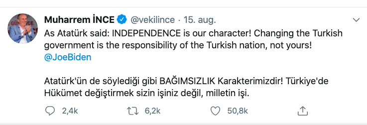 Muharrem İnce, som var Erdogans hovedutfordrer ved presidentvalget i 2018, svarer Biden med Atatürks ord: «INDEPENDENCE is our character!» (uavhengighet er vår karakter), og peker på at et regjeringsskifte er den tyrkiske nasjonens ansvar, ikke USAs.