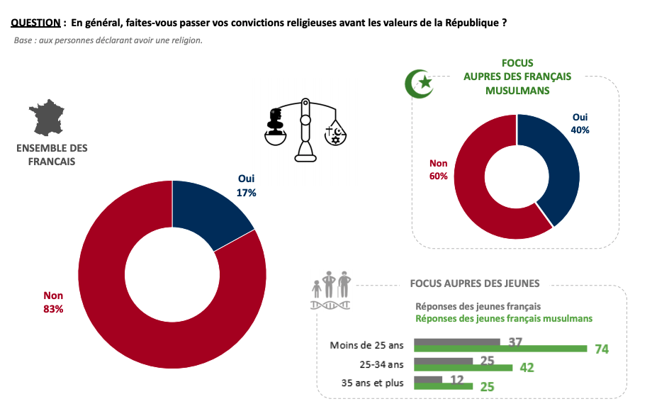 På spørsmålet om en generelt setter sin religiøse overbevisning foran republikkens verdier, svarer 83 prosent av franskmennene nei, mens 17 prosent sier ja. Muslimenes religiøse følelser er enda sterkere, da (bare) 60 prosent sier nei, mot 40 prosent som sier ja.