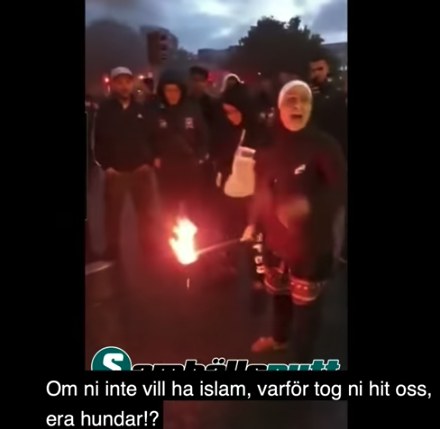 Med en fakkel i hånden hylte og skrek kvinnen om «griser» som skjendet koranen, om politiet som «hunder» som dertil konspirerer med «grisene», og åpenbart har den samme kvinnen ikke altfor mye til overs for svensker generelt:
