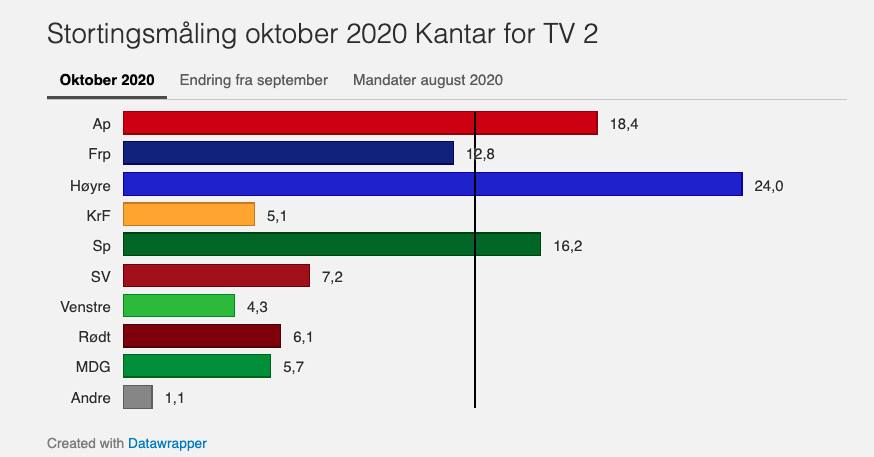 Høyre er målingens største parti, med 24 prosent. Både KrF og Venstre er over sperregrensa med hhv 5,1 (opp 1,2 fra september) og 4,3 prosent (opp 1,1). FrP havner på 12,8 prosent (opp 1,4).
